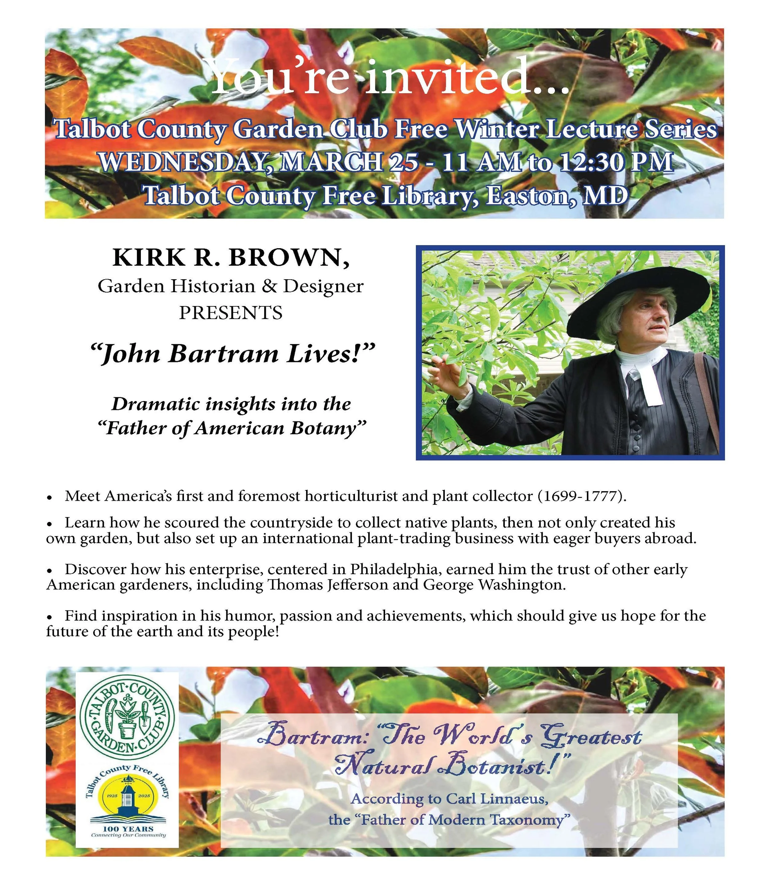 Kirk Brown will present a first person historical presentation on the life of John Bartram, America’s first and foremost horticulturist and plant collector. Close friends with Benjamin Franklin, Thomas Jefferson, and George Washington, he is credited with introducing more than 200 of America’s native plants to international trade. His humor, passion and achievements will entertain, inspire and awe as he shares hope for the future of the earth and people who inhabit it.